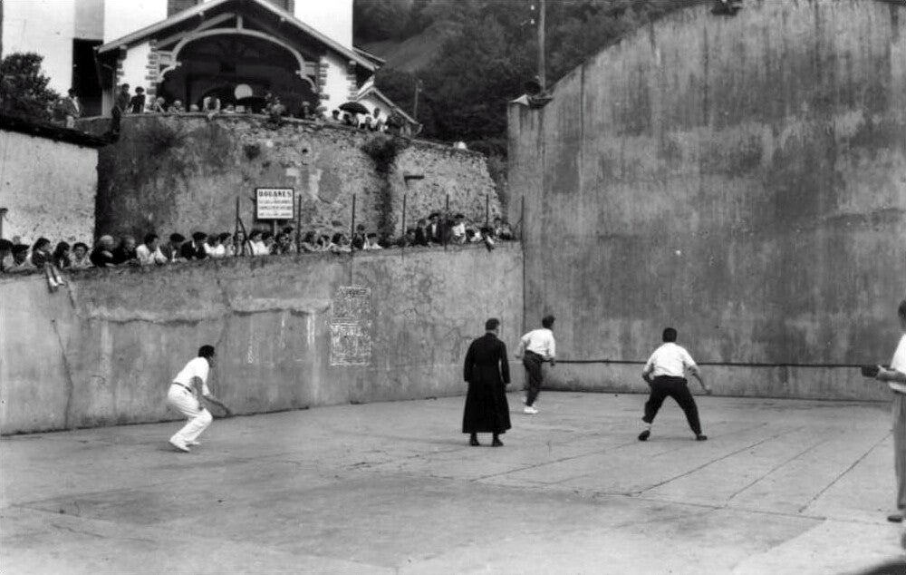 Cette image, que l’on pourrait croire insolite aujourd’hui, était autrefois chose courante dans bien des villages du Pays basque. Dès le XVIIIe siècle, les prêtres du diocèse de Bayonne s’adonnaient déjà au jeu de paume. Devant certaines dérives vestimentaires, l’évêque dut rappeler la règle : soutane ou redingote noire, courte ou boutonnée droit sur la poitrine.