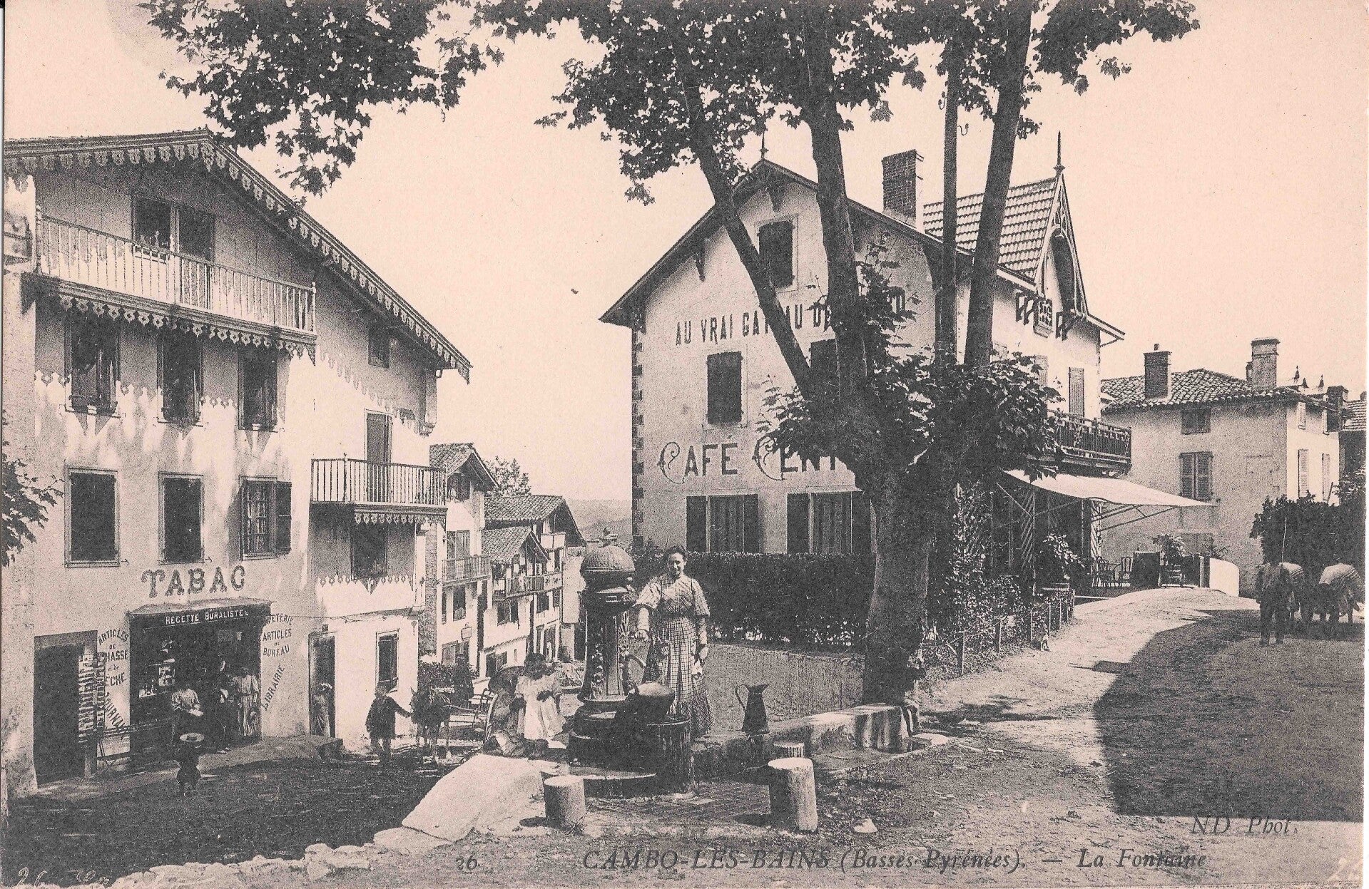 Sur cette carte postale légèrement jaunie par le temps, Cambo-les-Bains s’éveille doucement en ce début de matinée. À droite de l’image, on reconnaît la devanture du tabac, modeste, avec sa devanture en bois sombre. Quelques personnes discutent devant la porte pendant qu’un jeune homme passe sur la route, tenant un âne par la bride. L’animal trotte paisiblement, chargé d’un sac ou de quelques fagots.