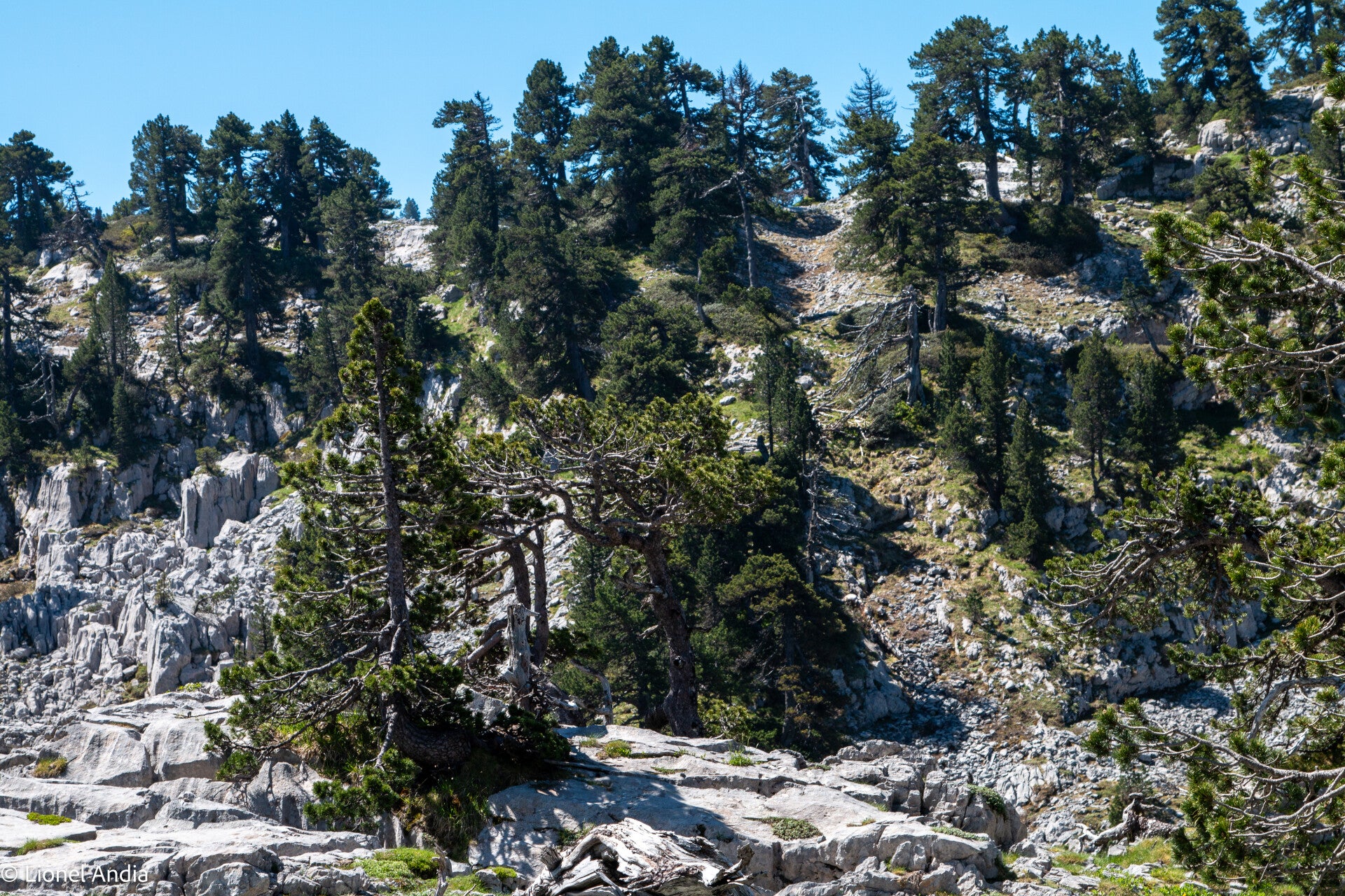 Dans les zones les plus élevées, on observe des individus isolés, au port tortueux, poussant au milieu de rochers et de blocs imposants. Sur les dalles calcaires, le pin à crochets adopte l’allure d’un bonsaï naturel, alors que dans des conditions plus favorables, il peut atteindre 15 à 20 mètres de hauteur et vivre plus d’un millénaire.