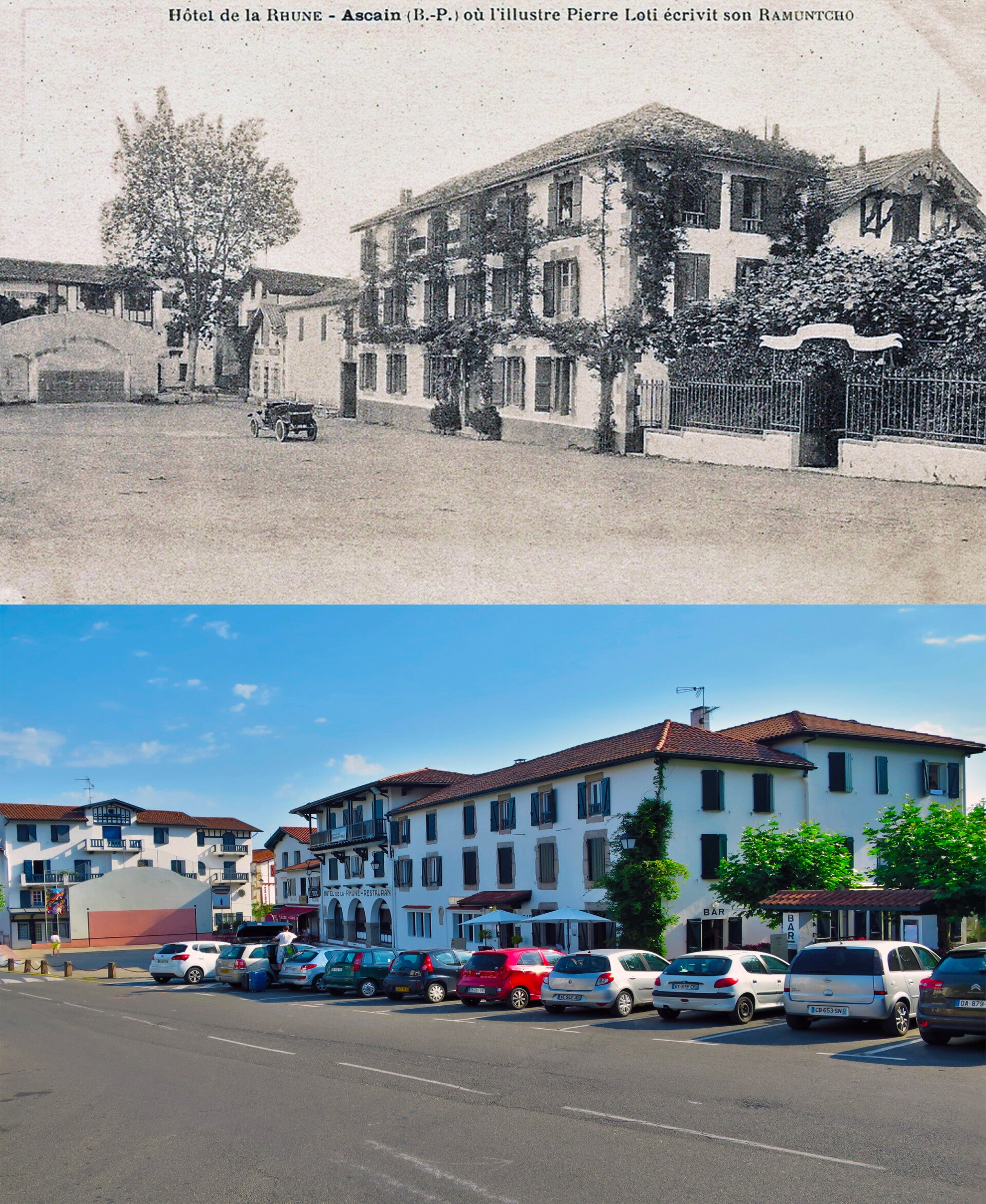 Le fronton et la place d'Ascain circa 1910 et en 2020
