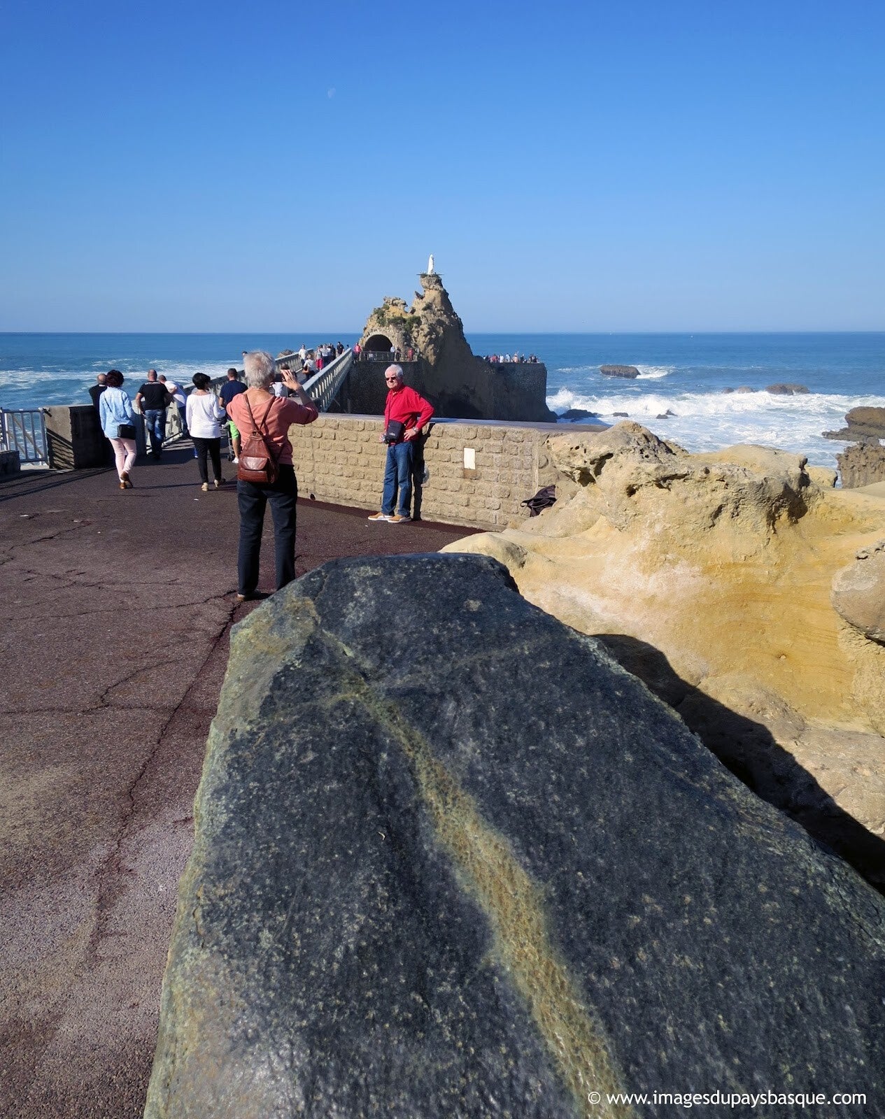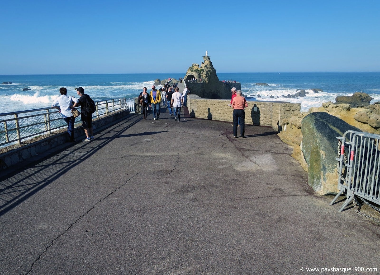 Petite curiosité patrimoniale : durant les travaux de 1884, les ouvriers mirent au jour un bloc d’ophite, une pierre volcanique locale. Transporté à l’aide d’un attelage de bœufs, ce bloc fut placé à droite de l’entrée de la passerelle du Rocher de la Vierge… où il se trouve encore aujourd’hui, témoin discret de l’histoire de Biarritz.
