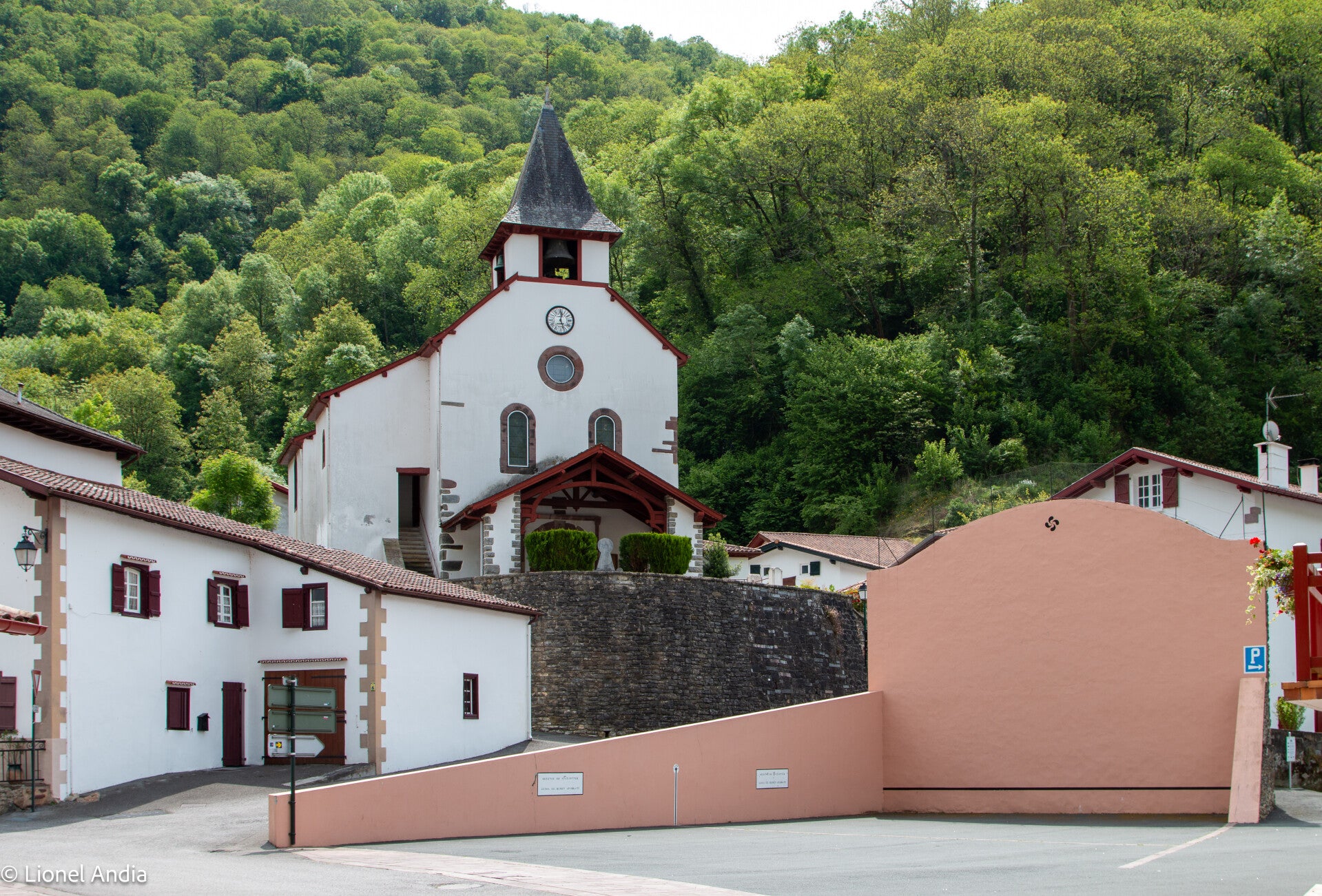 Dans la région de Saint-Jean-Pied-de-Port, certaines églises sont bâties en grès rose extrait du mont Arradoy, une pierre locale qui les rend immédiatement reconnaissables. En Soule, un autre élément architectural attire l’attention : le mur de façade, souvent surmonté d’un clocher dit trinitaire ou calvaire.