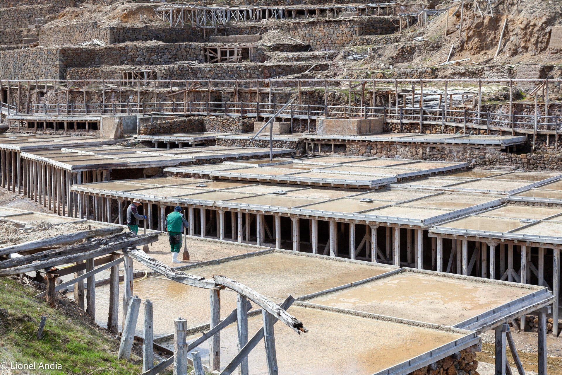 Un réseau ingénieux de canaux en bois qui distribuent l’eau salée par simple gravité.